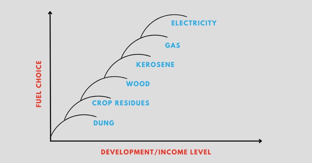 As people progress in terms of income and development, they move from using solid fuels like wood, crop residues, and dung to liquid fuels like kerosene, and eventually to gas and electricity.