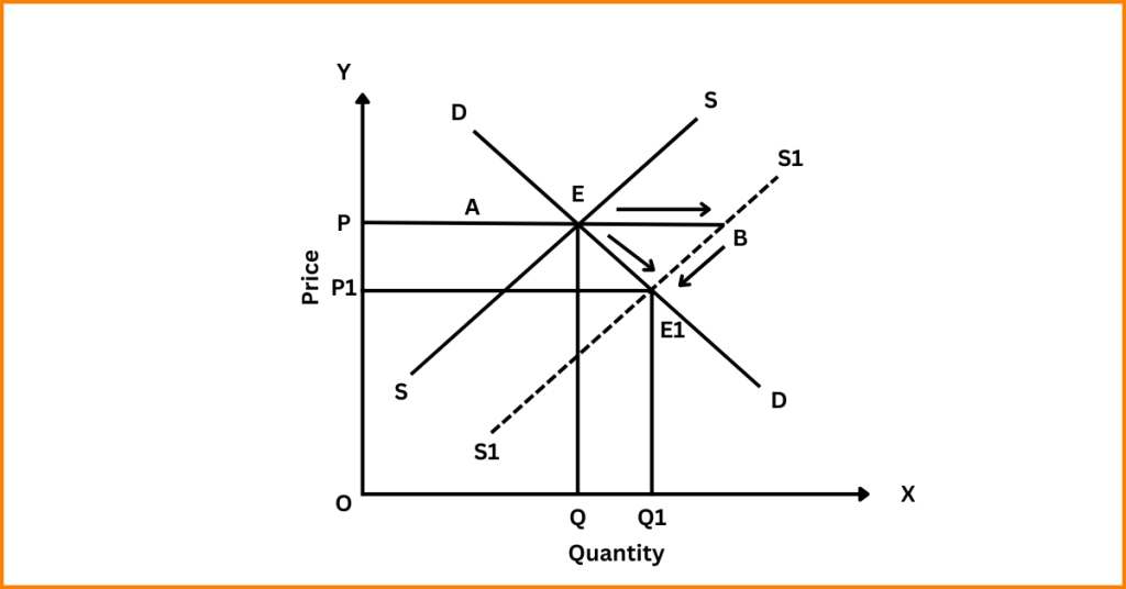 - Chain of effects of increase in supply: Due to increase in supply, the supply curve shifts to the right from S to S₁. This creates excess supply (=ES) at the given equilibrium price P.