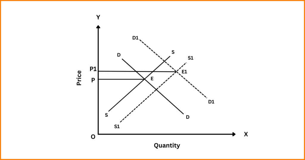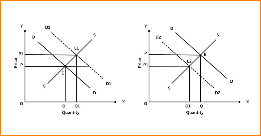 - Increase in Demand: When demand increases, the demand curve shifts rightward, creating excess demand at the given equilibrium price. As a result, prices rise due to competition among buyers, leading to a rise in supply and a fall in demand. This process continues until a new equilibrium is reached, where both the price and quantity are higher than before.