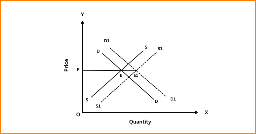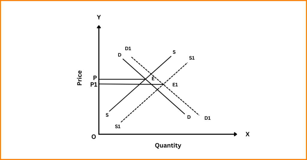 - This continues till the equilibrium at E₁. At the new equilibrium, the price falls to P₁, but the quantity rises to Q₁.