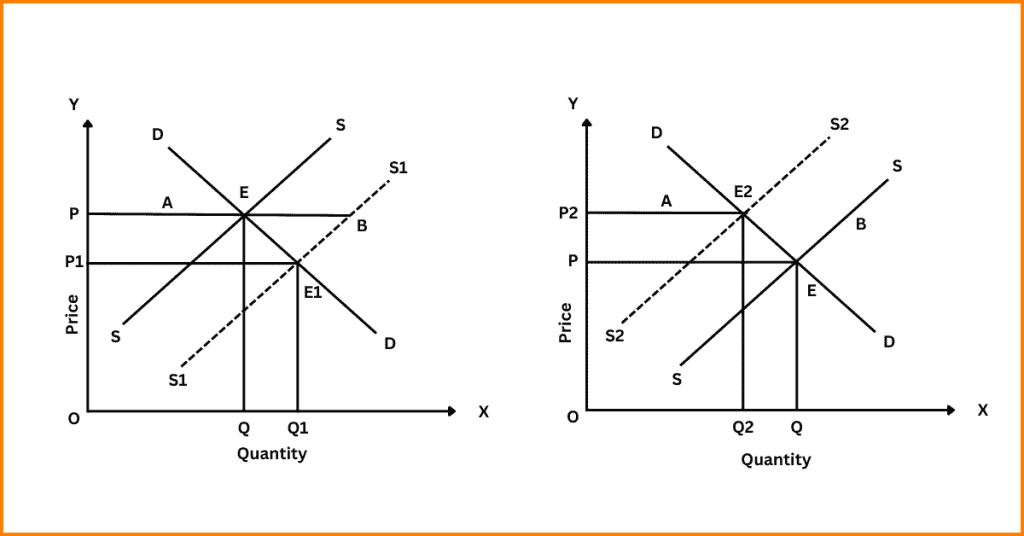 - Increase in Supply: When supply increases, the supply curve shifts rightward, creating excess supply at the given price. Producers lower prices to sell more, which leads to a fall in price and a rise in quantity demanded. This continues until a new equilibrium is reached with a lower price and a higher quantity.